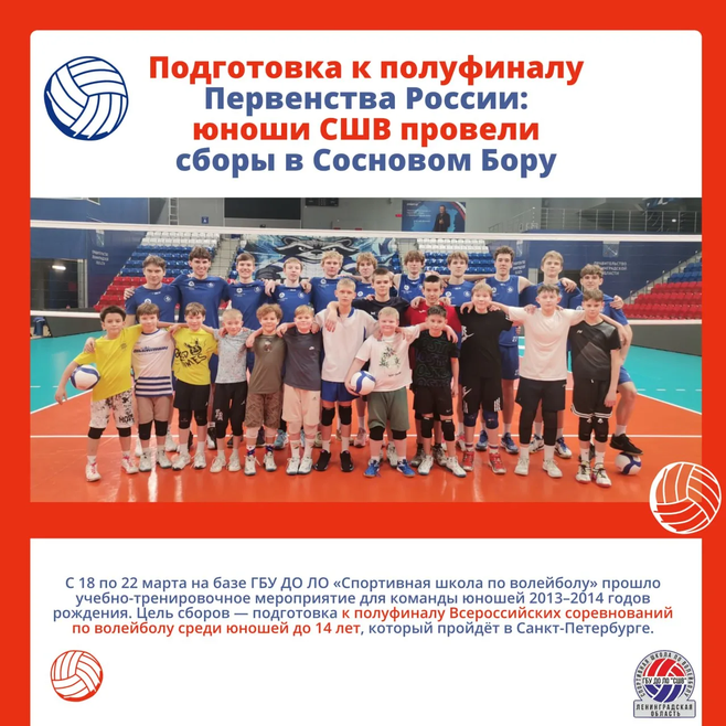 С 18 по 22 марта на базе ГБУ ДО ЛО «Спортивная школа по волейболу» прошло учебно-тренировочное мероприятие для команды юношей 2013–2014 годов рождения. Цель сборов — подготовка к полуфиналу Всероссийских соревнований по волейболу среди юношей до 14 лет, который пройдёт в Санкт-Петербурге.